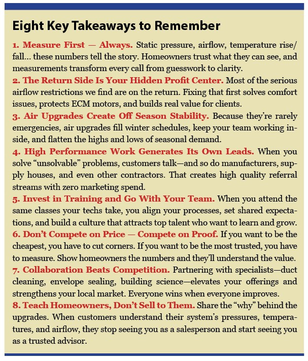 During sales calls, I measure static and airflow, lay out the numbers, and explain why a specific scope (like a return rebuild, proper filtration, surge protection, commissioning) is the right fit. A common reaction is, “The last five guys didn’t do any of this.”