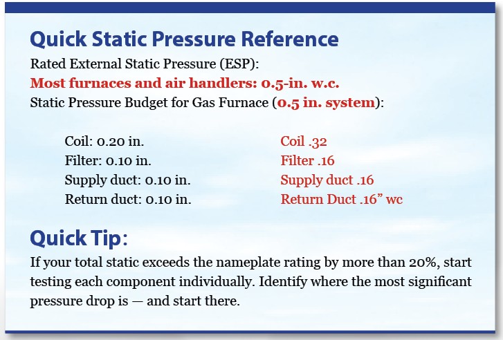 In commercial air balancing, engineers provide clients with the building’s required airflow and static pressure. But in residential HVAC, that’s up to you. That’s why NCI developed static pressure budgets for furnaces and air handlers. They’re not carved in stone, but they’ll get you into the ballpark.